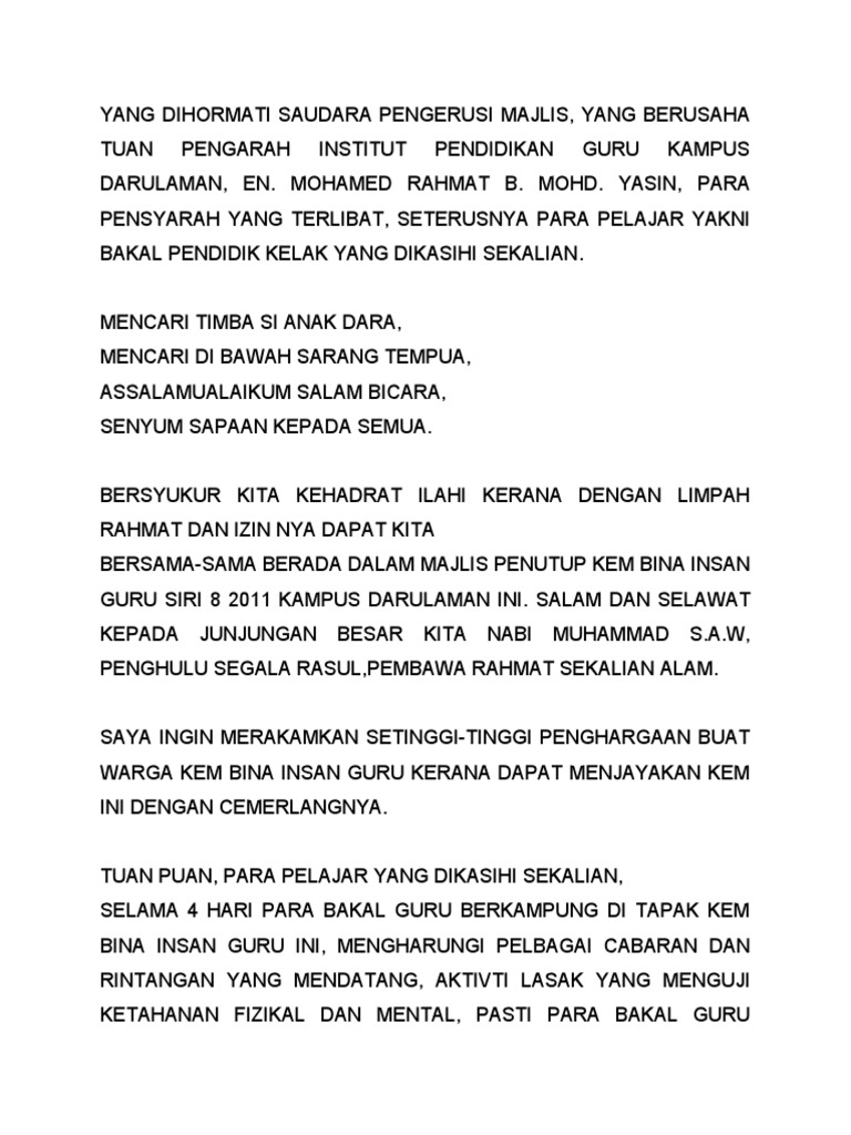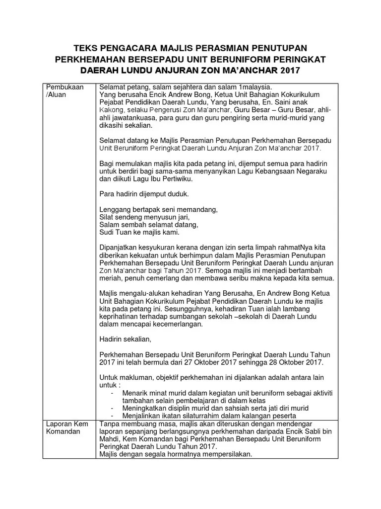 2 Bismillahirahmanirrahim Yang berusaha saudara pengacara majlis Yang Dihormati. UCAPAN TEKS MAJLIS PENUTUP PERKHEMAHAN BIL AGENDA TEKS 1 Ketibaan tetamu khas Diumumkan ketibaan Datuk Lai Yeng Fock selaku pemilik atau pengerusi kem Tadom Base. Ucapan perasmian penutupan itu juga turut diiringi dengan berita gembira daripada Guru Besar sekolah Encik Abdul Maid Hamzah bahawa hari Isnin bersamaan 16hb April diumumkan sebagai cuti.