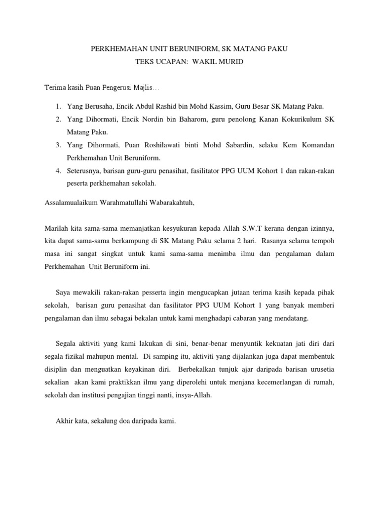Ucapan Perasmi Penutup Guru Besar. PERKHEMAHAN UNIT BERUNIFORM SK MATANG PAKU TEKS UCAPAN. Latihan Amali pelatih-pelatih Senior 24hb.